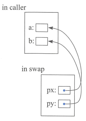 void swap (int *px, int *py) // 이 선언은 원본 변수의 주소를 포인터로 받기 때문에 조작하면 원본이 변한다.