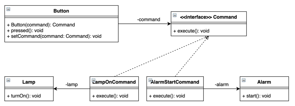 Button클래스는 램프 기능을 실행할 때 Lamp클래스의 turnOn메소드나 Alarm클래스의 start메소드를 직접 호출하지 않는다. 대신 미리 약속된 Command인터페이스의 execute메소드를 호출한다.