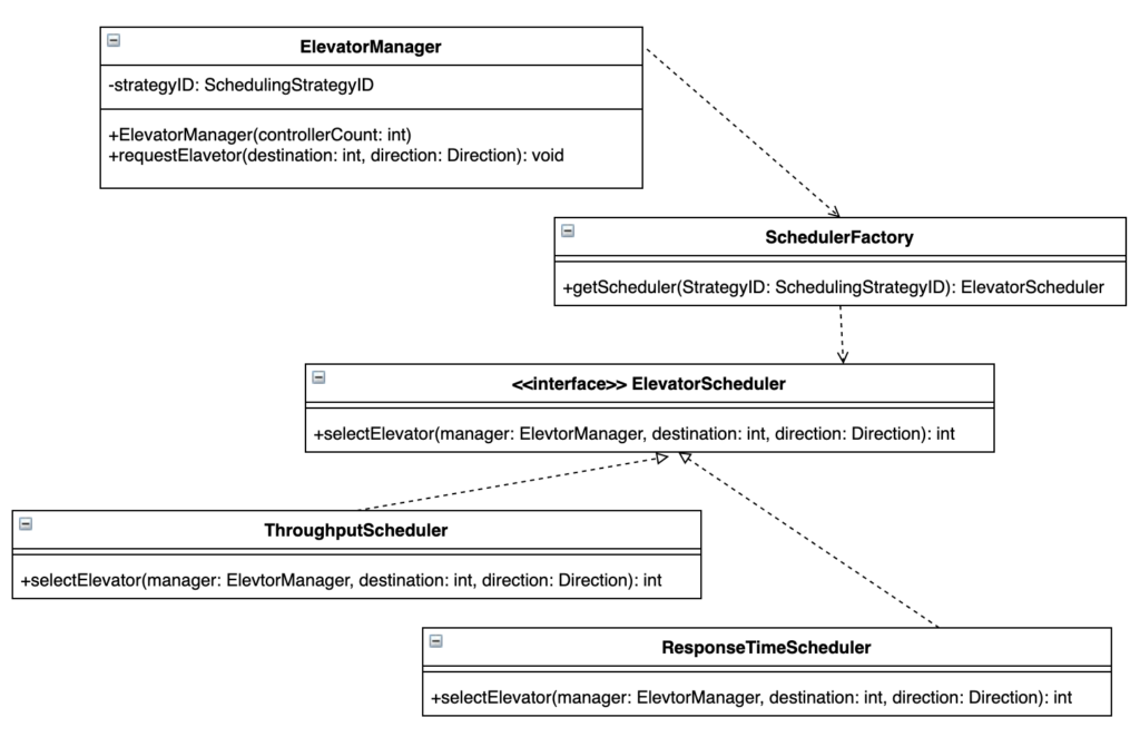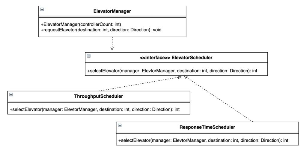 처리량 전략이나 대기시간 전략 모두 ElevatorManager입장에서는 엘리베이터 스케줄링 전략의 일종이다. 그러므로 ElevatorManager는 두 객체를 생성한 후 이를 각ㄱ의 클래스가 안이라 ElevatorScheduler 인터페이스를 통해서 사용한다. 이는 결과적으로 Strategy패턴을 활용한다.