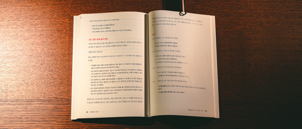 개인적으로 코드 정리에 대해 당연히 알고있다고 생각했지만 말로 설명하기는 근거나 설득력이 떨어진다고 스스로 생각했는데, 이 책은 그에 대한 이유를 명확하게 글로 풀어낸 유일한 책이 아닐까 싶다.