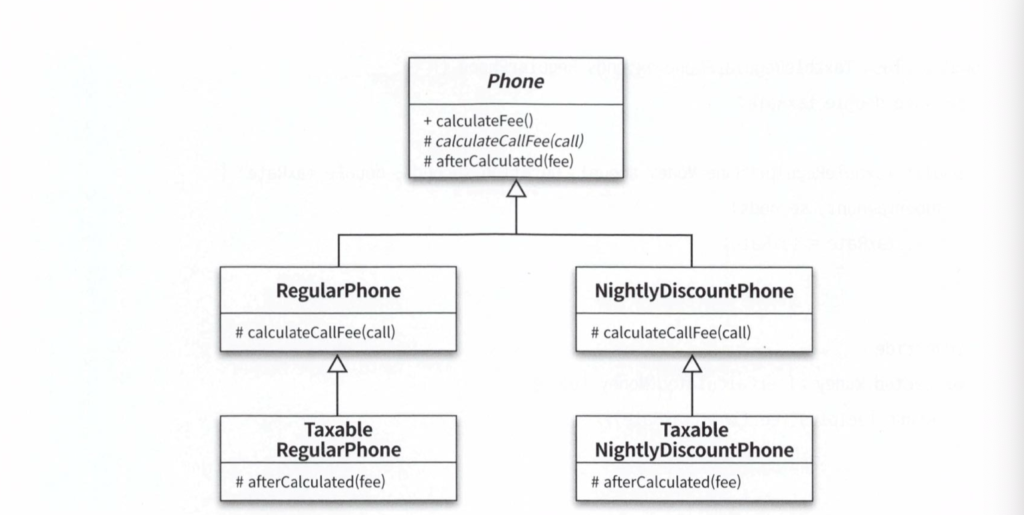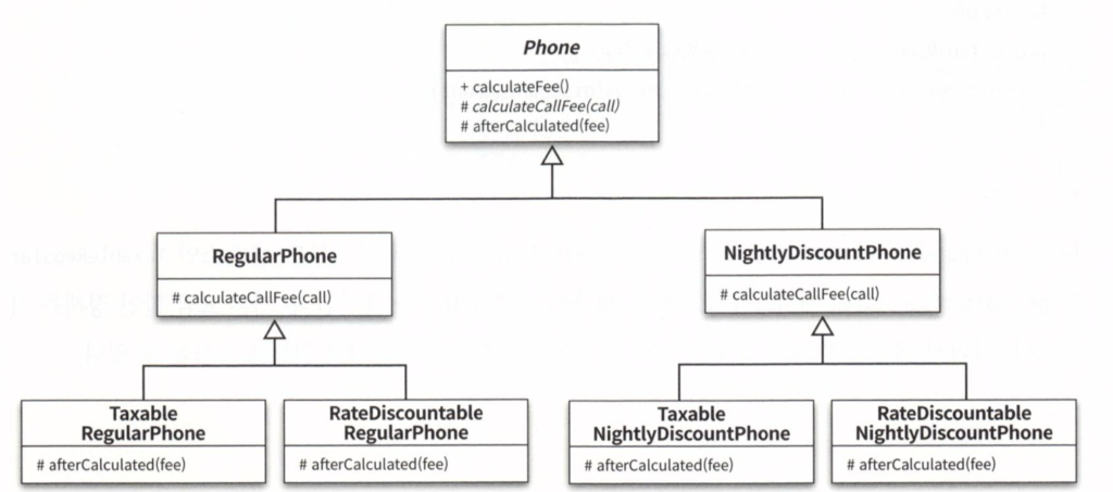 만약 일반 요금제에 세금 정책을 조합해야 한다면 RegularPhone 클래스를 상속받은 TaxableRegularPhone 클래스를 추가한다. RegularPhone.calculateFee()는 일반 요금제 규칙에 따라 계산된 요금을 반환하므로 이 반환값에 세금을 부과해 반환하면 일반 요금제와 세금 정책을 조합한 요금을 계산할 수 있다.