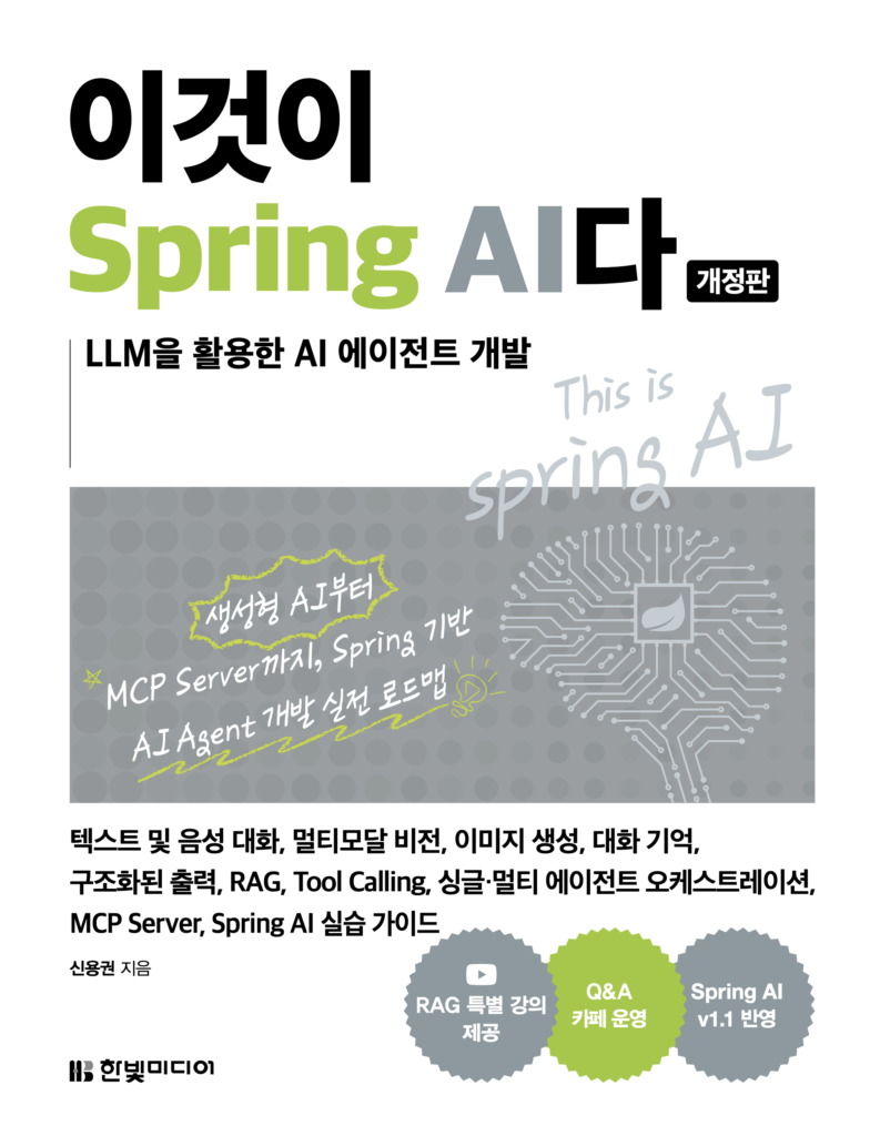 지난달에 LangChain 기반으로 AI 에이전트를 만드는 책을 읽었다. 체인 구성, RAG, 메모리, MCP, 종합 프로젝트까지 한 호흡으로 따라가면서 에이전트가 대강 어떤 구조로 돌아가는지 감을 잡을 수 있었다. 그런데 그 책은 Python이었다. 나는 Java 개발자다. 실무에서 Spring Boot와 Spring Framework를 매일 쓰고 있고, 솔직히 익숙한 생태계에서 AI를 다룰 수 있으면 그게 제일 좋다.