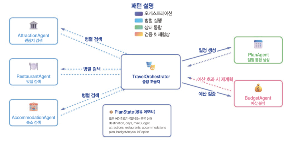 여러 에이전트가 협업할 때 중간 결과물을 어떻게 공유하느냐가 중요하다. 이 책에서는 PlanState라는 공유 상태 객체를 정의한다. 요구사항, 에이전트별 결과, 예산 분석, 최종 일정, 재계획 플래그까지 전체 워크플로우의 상태가 하나의 객체에 담긴다.